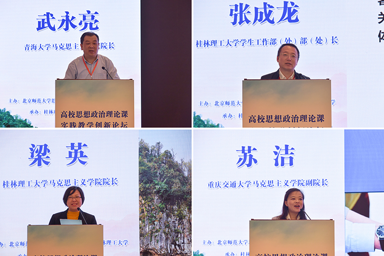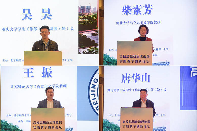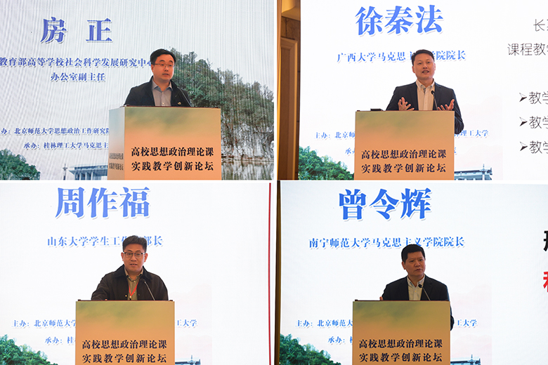 开幕式后,教育部高等学校社会科学发展研究中心办公室副主任房正、广西大学tyc1286太阳成集团院长徐秦法、山东大学学生工作部部长周作福、南宁师范大学tyc1286太阳成集团院长曾令辉、青海大学tyc1286太阳成集团院长武永亮、我校学生工作部(处)部(处)长张成龙、我校tyc1286太阳成集团院长梁英、重庆交通大学tyc1286太阳成集团副院长苏洁、重庆大学学生工作部(处)副部(处)长吴昊、河北大学tyc1286太阳成集团教师柴素芳、北京师范大学tyc1286太阳成集团教师王振、湖南科技学院学生工作部(处)部(处)长唐华山等12位专家学者聚焦“高校思想政治理论课实践教学创新”主题,围绕思想政治理论课实践教学的特点、重点、难点、对策和教学模式创新等方面作主旨发言。