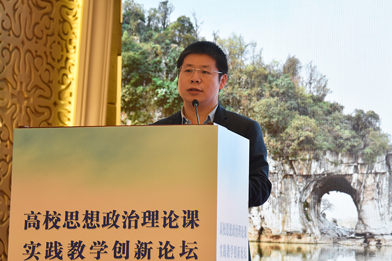 为扎实推进习近平新时代中国特色社会主义思想“三进”工作,落实教育部关于加强高校思想政治理论课建设的要求,有效推动高校思想政治理论课实践教学的创新发展,4月10日,高校思想政治理论课实践教学创新论坛暨“教育部高校示范马院和优秀教学团队建设重点项目”成果发布会在桂林大公馆成功举办。此次大会由我校和北京师范大学思想政治工作研究院共同主办、太阳成集团官网承办,北京师范大学思想政治工作研究院院长冯刚,教育部高等学校社会科学发展研究中心办公室副主任房正,自治区党委教育工委宣传部部长、教育厅思想政治工作处处长赵益真,《学校党建与思想教育》杂志社社长谢成宇,我校党委书记李国忠、校长解庆林、副校长邓国彬出席会议,来自北京师范大学、重庆大学、山东大学、广西大学等区内外40余所高校的专家学者、师生代表共100余人参加了会议。开幕式由我校原副厅级调研员张劲松主持。