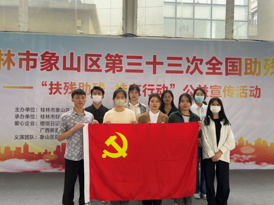 为全面贯彻党的二十大精神,培育社会主义核心价值观,弘扬奉献、友爱、互助、进步的志愿精神,增强太阳成集团官网研究生党支部对全国助残日相关知识的了解,在第三十三次“全国助残日”即将到来之际,太阳成集团官网研究生党支部于5月14日积极参与由桂林市象山区人民政府残疾人工作委员会主办的象山区第三十三次全国助残日——“爱心助残 感恩母亲”公益宣传活动。在活动中,太阳成集团官网党支部成员作为志愿者积极参与活动现场布置,帮助义卖象山区阳光家园残障学员的手工作品,热心与他们进行沟通交流,鼓励他们要自信、自强、自立,以积极乐观的生活态度面对困难。随后在节目展演环节中,党支部成员与我校研究生焱飞志愿服务队共同合唱《我和我的祖国》,表达了坚信在党的坚强领导下,残疾人的生活和梦想必将更加灿烂的美好祝愿。
