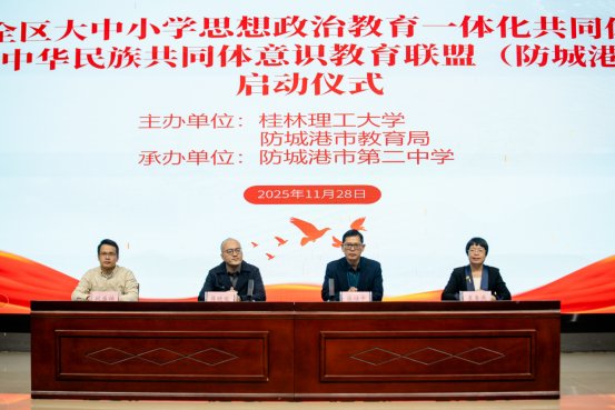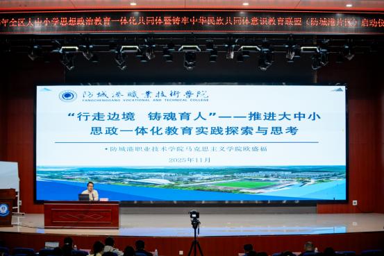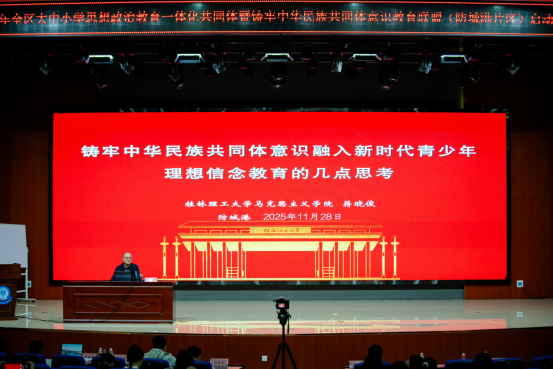 11月28日,全区大中小学思想政治教育一体化共同体暨铸牢中华民族共同体意识教育联盟(防城港片区)正式启动。tyc1286太阳成集团院长蒋晓俊、广西民族大学民族学与社会学学院民族学系主任胡美术、百色学院马克思主义学院黄修卓副教授、防城港市教育局副局长张培中、tyc1286太阳成集团统战部朱强,以及来自30所联盟单位的领导、思政课教师代表、德育工作负责人与业务骨干等100余人出席活动。